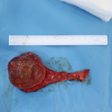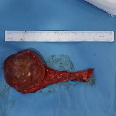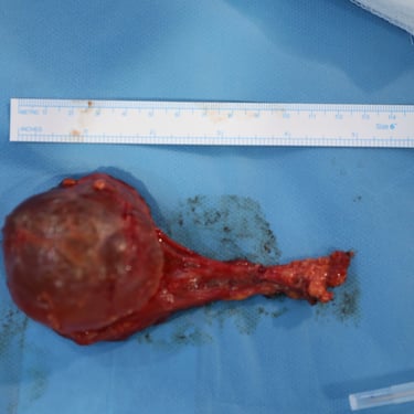 The patient underwent surgical excision of the left-sided neck mass under general anesthesia, along with excision of a concurrent left scalp lesion for cosmetic reasons. The excised specimens included: