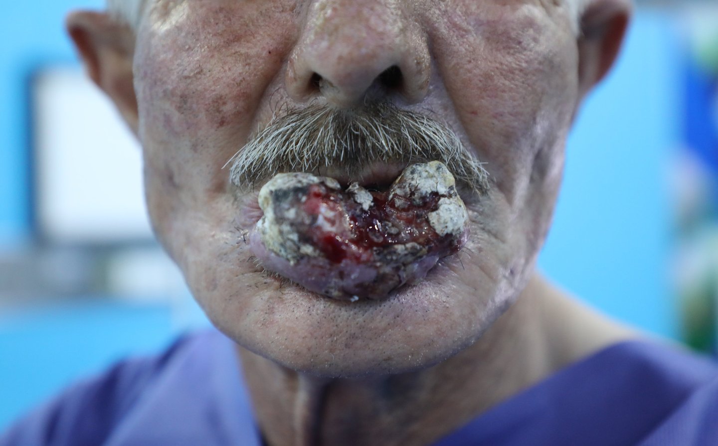 A 58-year-old male presented to the surgical oncology clinic with a progressively enlarging ulcerative lesion on the lower lip, present for approximately one year. He is a known case of hypertension, for which he is receiving antihypertensive medications. The patient has a longstanding history of heavy tobacco use and remains an active smoker. He does not have a known history of diabetes, hepatitis, or other significant comorbidities. The persistent nature and progressive enlargement of the lesion prompted further investigation for malignancy.