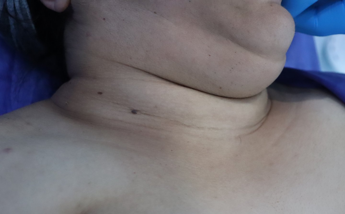 A 35-year-old female presented with an anterior neck swelling that had been gradually enlarging over the past one year. She reported no associated symptoms such as pain, dysphagia, or dyspnea. Her past medical and surgical history was unremarkable, and there was no family history of neck masses or endocrine disorders. On physical examination, the neck mass was soft to mildly firm in consistency and non-tender. There were no overlying skin changes, and no signs of local invasion were noted.